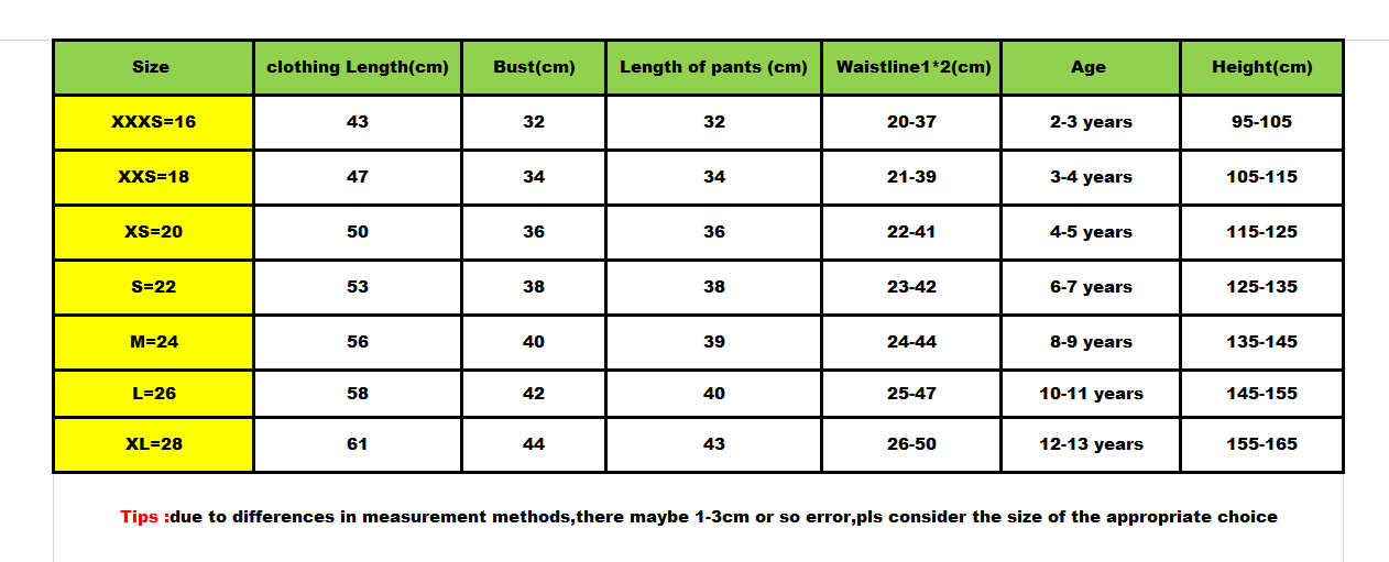 Material: 100% Polyester Size Advice: please check the real measure on the photo adult size kid size Note: 1. There may be 1-2 cm deviation in different sizes, locations, and the stretch of fabrics. Size chart is for reference only; there may be a little different from what you get. 2. Color may be lighter or darker due to the different PC display. 3. There may be a slight difference in detail and pattern. 4. Wash it by hand in 30-degree water, hang to dry in shade, prohibit bleaching.